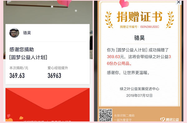 - 今天终于结束了出差的日子,回来先把最近收到的打赏通过腾讯公益平台全部捐赠给了绿之叶,总共捐出了111笔打赏。