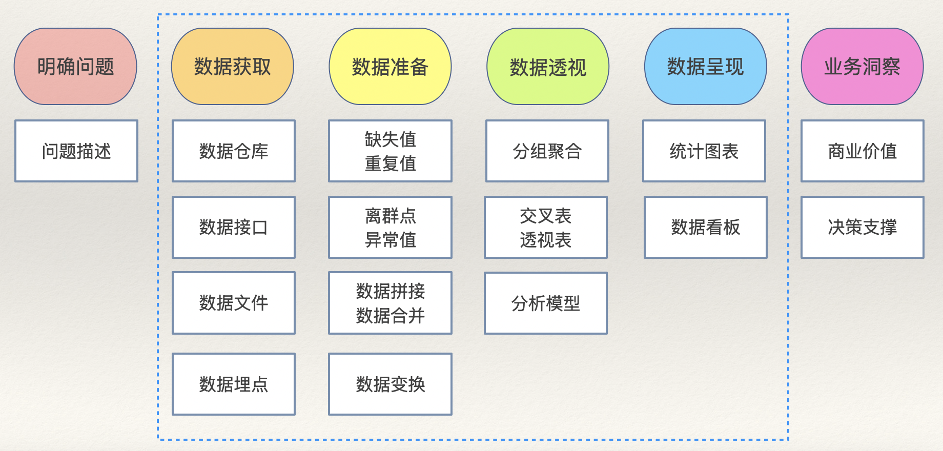 学习和使用 pandas 重点是DataFrame的应用,我们建议大家按照数据分析的流程来掌握对应的函数和方法,这样做往往会事半功倍。数据分析流程如下图所示,其中蓝色虚线圈中的部分就是可以通过 BI 工具(如:Power BI、Tableau等)或 Python 程序来完成的部分。