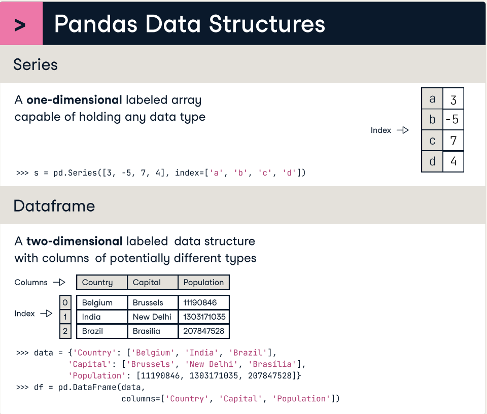 DataFrame:表示二维数据,类似于 Excel 电子表格,行和列都有自己的索引(标签),可以通过索引访问行、列、单元格。
