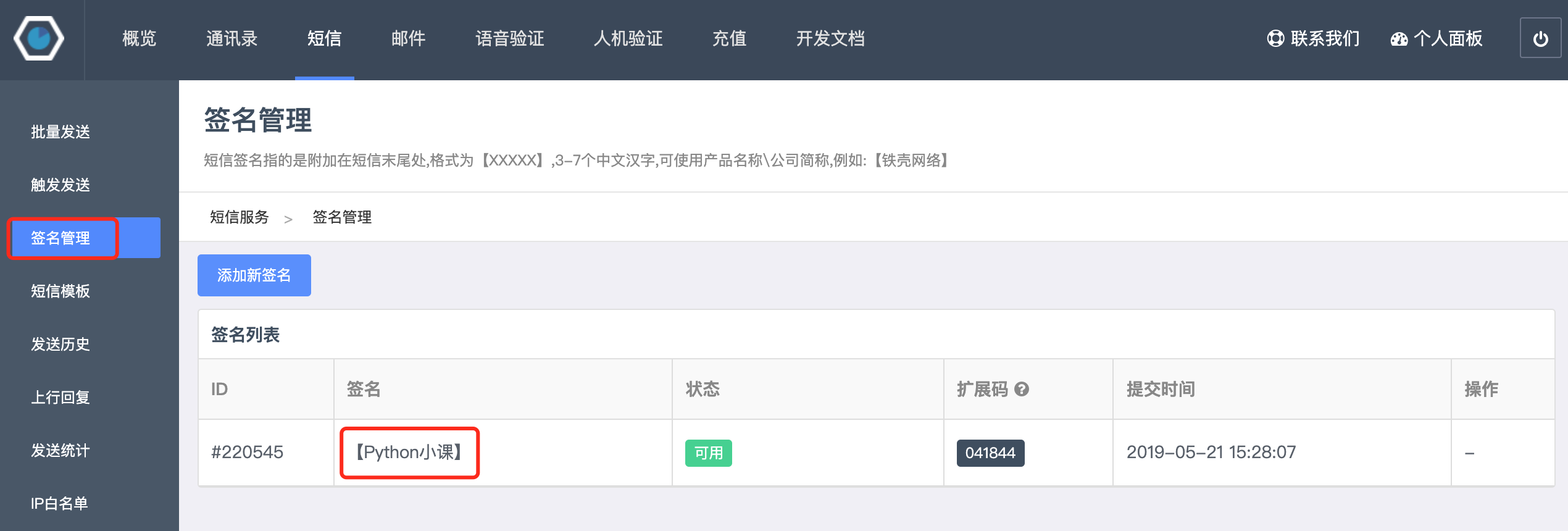 目前,大多数短信平台都会要求短信内容必须附上签名,下图是我在螺丝帽平台配置的短信签名“【Python小课】”。有些涉及到敏感内容的短信,还需要提前配置短信模板,有兴趣的读者可以自行研究。一般情况下,平台为了防范短信被盗用,还会要求设置“IP 白名单”,不清楚如何配置的可以咨询平台客服。
