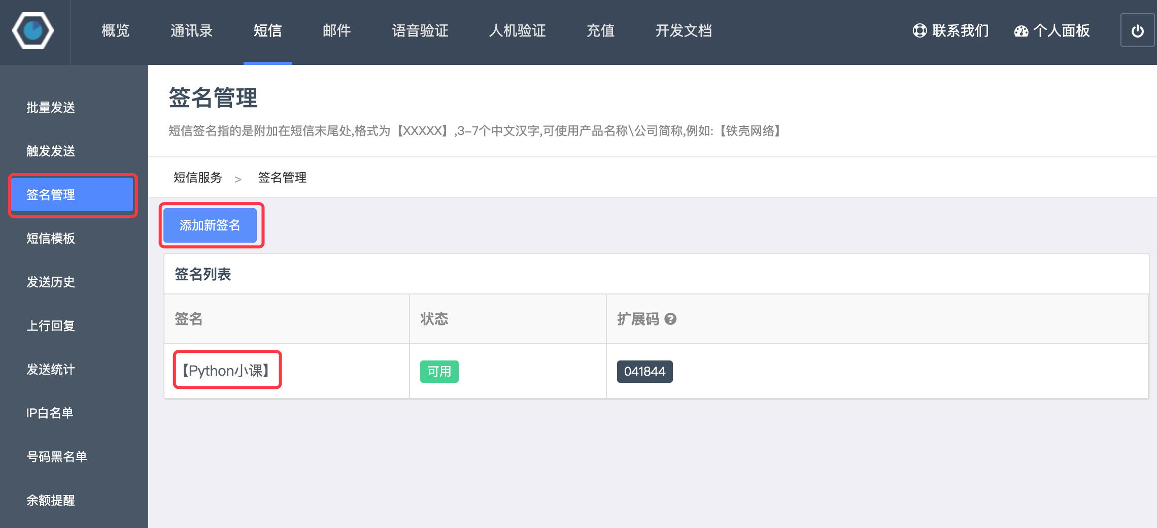 点击“签名管理”可以添加短信签名,短信都必须携带签名,免费试用的短信要在短信中添加“【铁壳测试】”这个签名,否则短信无法发送。