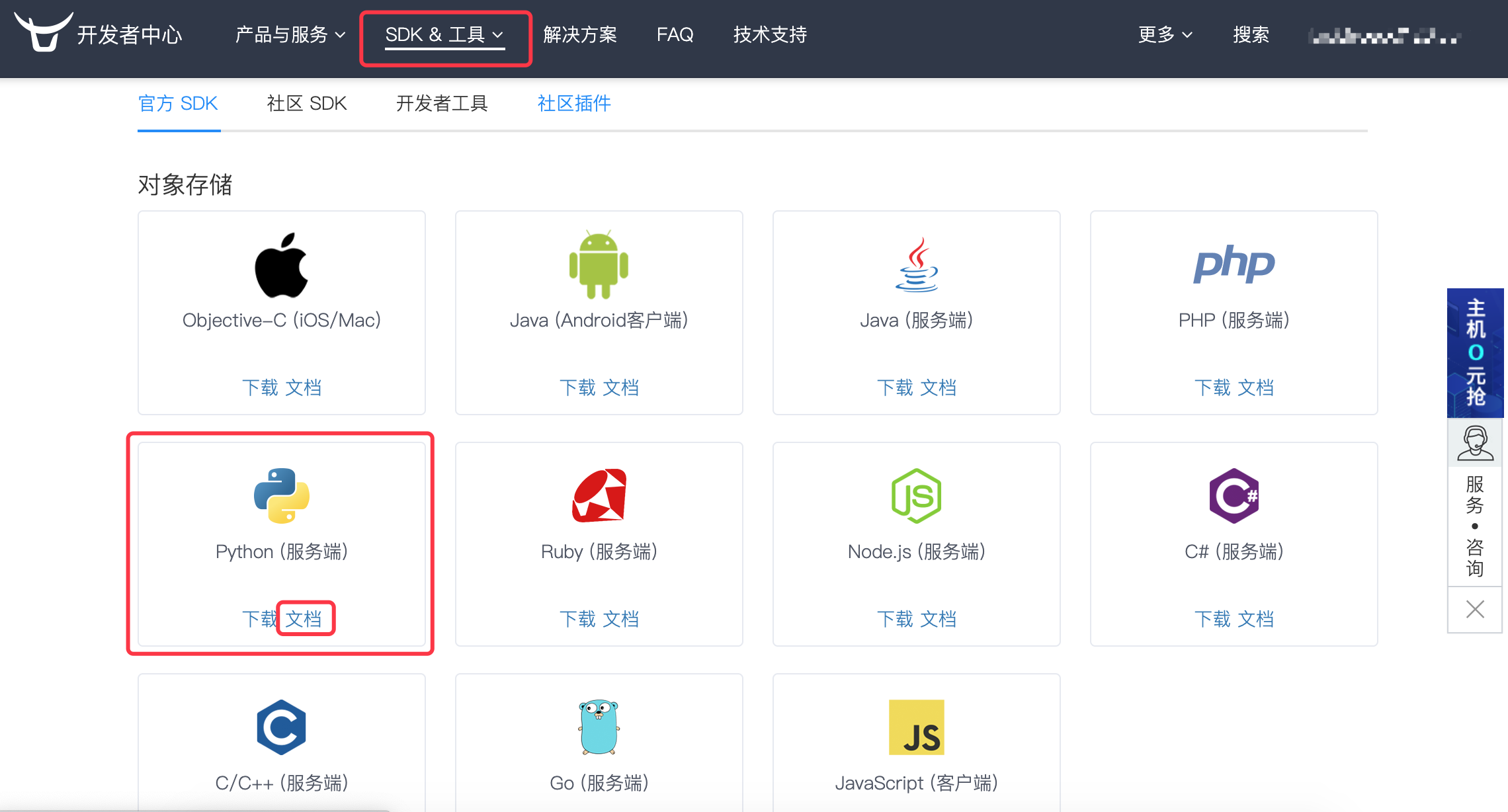 点击网页上方菜单中的“文档”,进入到七牛开发者中心,选择导航菜单中的“SDK&工具”并点击“官方SDK”子菜单,找到Python(服务端)并点击“文档”查看官方文档。