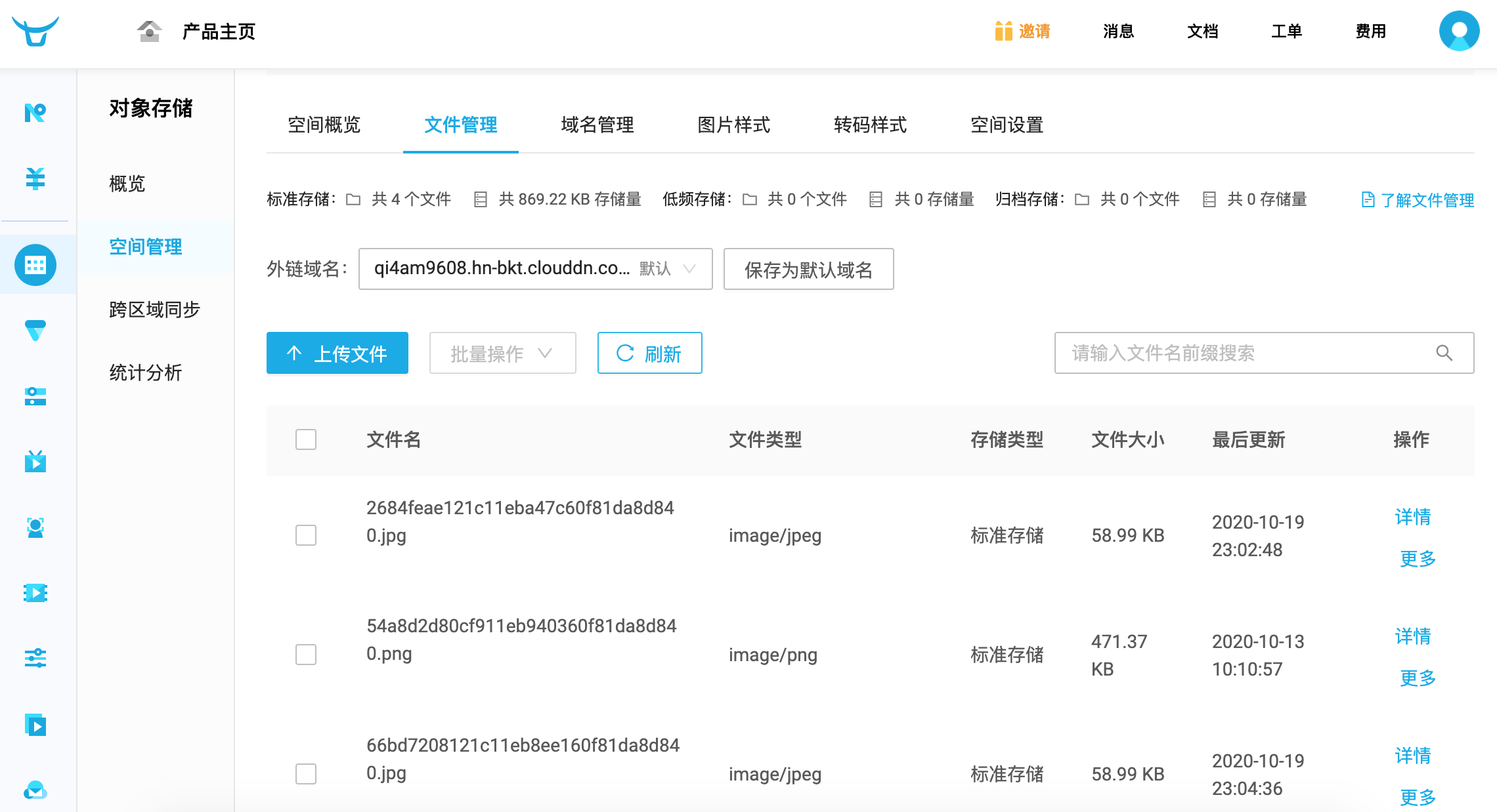 运行项目尝试文件上传的功能,文件上传成功后,可以在七牛云“空间管理”中点击自己空间并进入“文件管理”界面,在这里可以看到我们刚才上传成功的文件,而且可以通过七牛云提供的域名获取该文件。