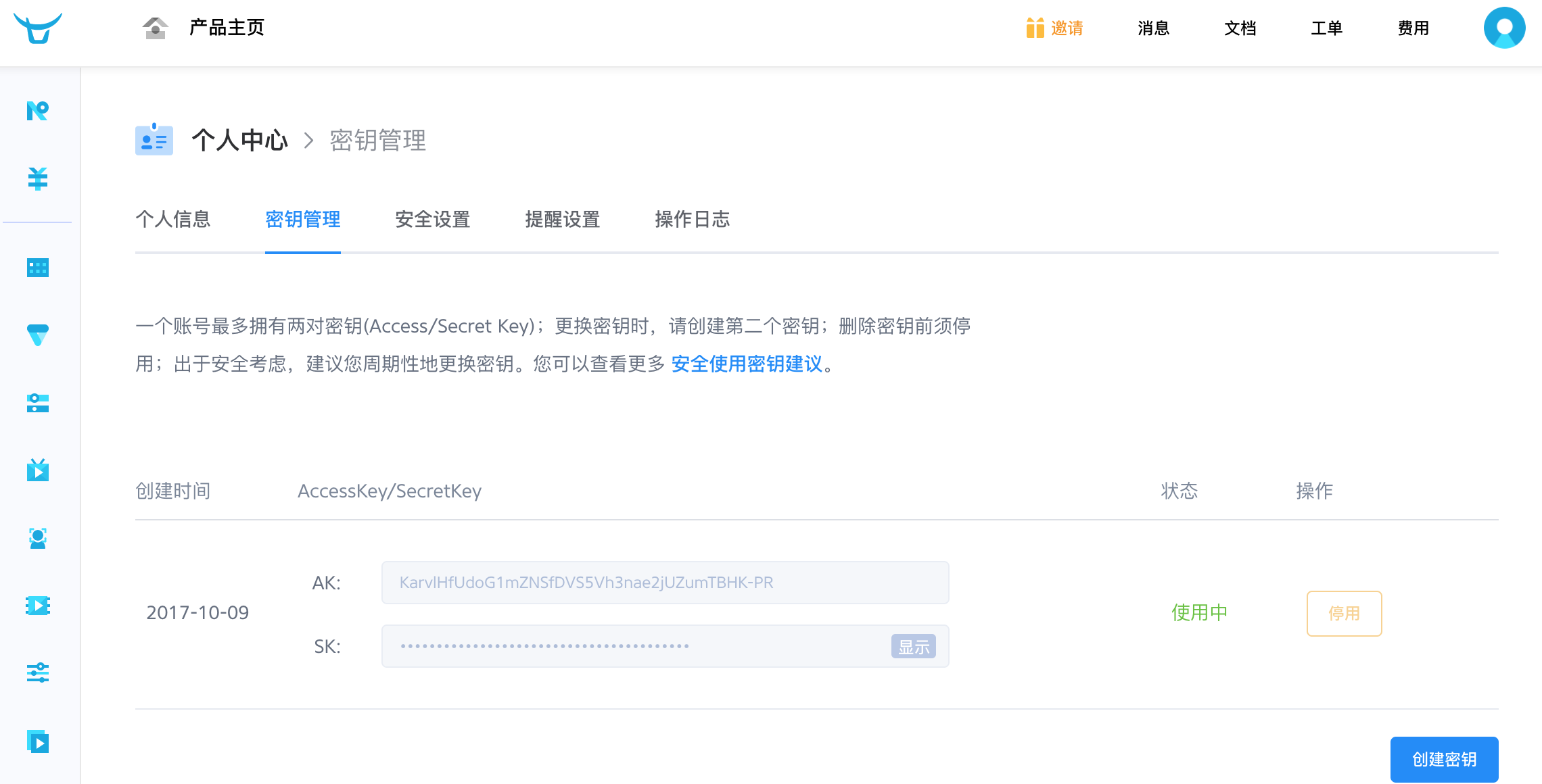 在网页的右上角点击个人头像中的“密钥管理”,查看自己的密钥,稍后在代码中需要使用AK(AccessKey)和SK(SecretKey)两个密钥来认证用户身份。