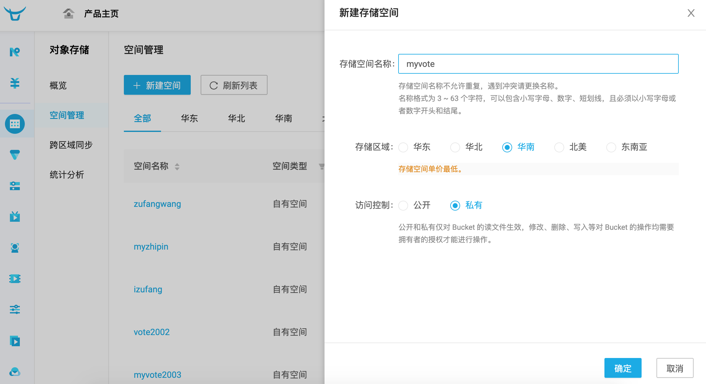 在空间管理中选择新建空间(例如:myvote),如果提示空间名称已被占用,更换一个再尝试即可。注意,创建空间后会提示绑定自定义域名,如果暂时还没有自己的域名,可以使用七牛云提供的临时域名,但是临时域名会在30天后被回收,所以最好准备自己的域名(域名需要备案,不清楚如何操作的请自行查阅相关资料)。