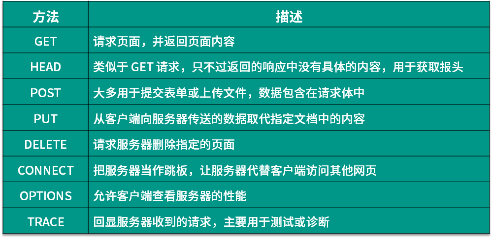 HTTP 请求通常是由请求行、请求头、空行、消息体四个部分构成,如果没有数据发给服务器,消息体就不是必须的部分。请求行中包含了请求方法(GET、POST 等,如下表所示)、资源路径和协议版本;请求头由若干键值对构成,包含了浏览器、编码方式、首选语言、缓存策略等信息;请求头的后面是空行和消息体。
