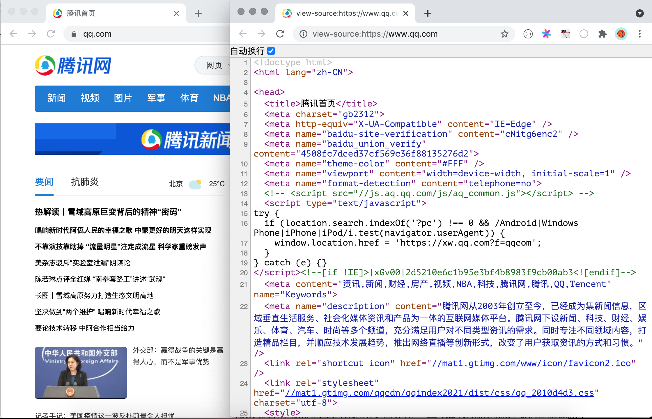 我们在浏览器中打开任意一个网站,然后通过鼠标右键菜单,选择“显示网页源代码”菜单项,就可以看到网页对应的 HTML 代码。