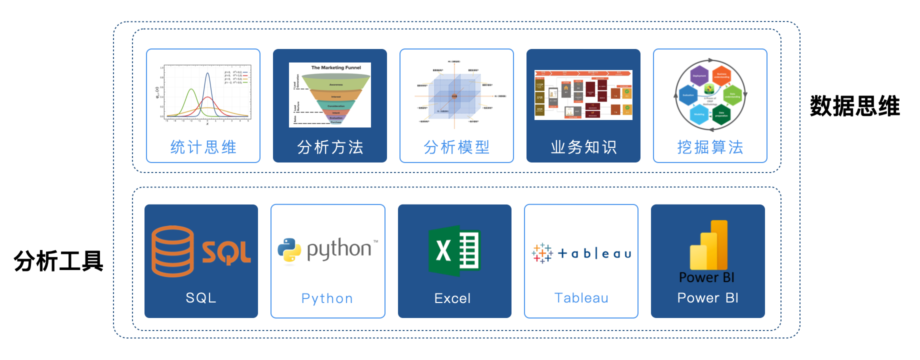 对于想从事数据分析工作的人来说,需要掌握两个部分的技能,一是“数据思维”,二是“分析工具”,如下图所示。