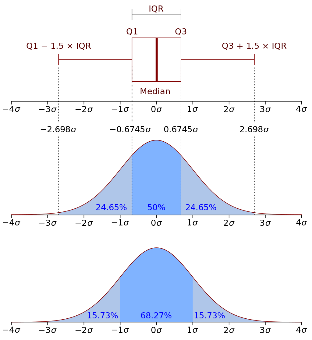 如果数据服从正态分布,依据3σ法则,异常值被定义与平均值的偏差超过三倍标准差的值。在正态分布下,距离平均值3σ之外的值出现的概率为 $\small{P(\lvert x - \mu \rvert \gt 3 \sigma) < 0.003}$ ,属于小概率事件。如果数据不服从正态分布,那么可以用远离均值的多少倍的标准差来描述,这里的倍数就是Z-score。Z-score以标准差为单位去度量某一原始分数偏离平均值的距离,公式如下所示。