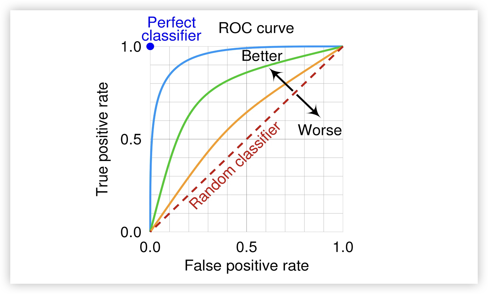 ROC(Receiver Operating Characteristic Curve)绘制了召回率与假正例率的关系,如下图所示。