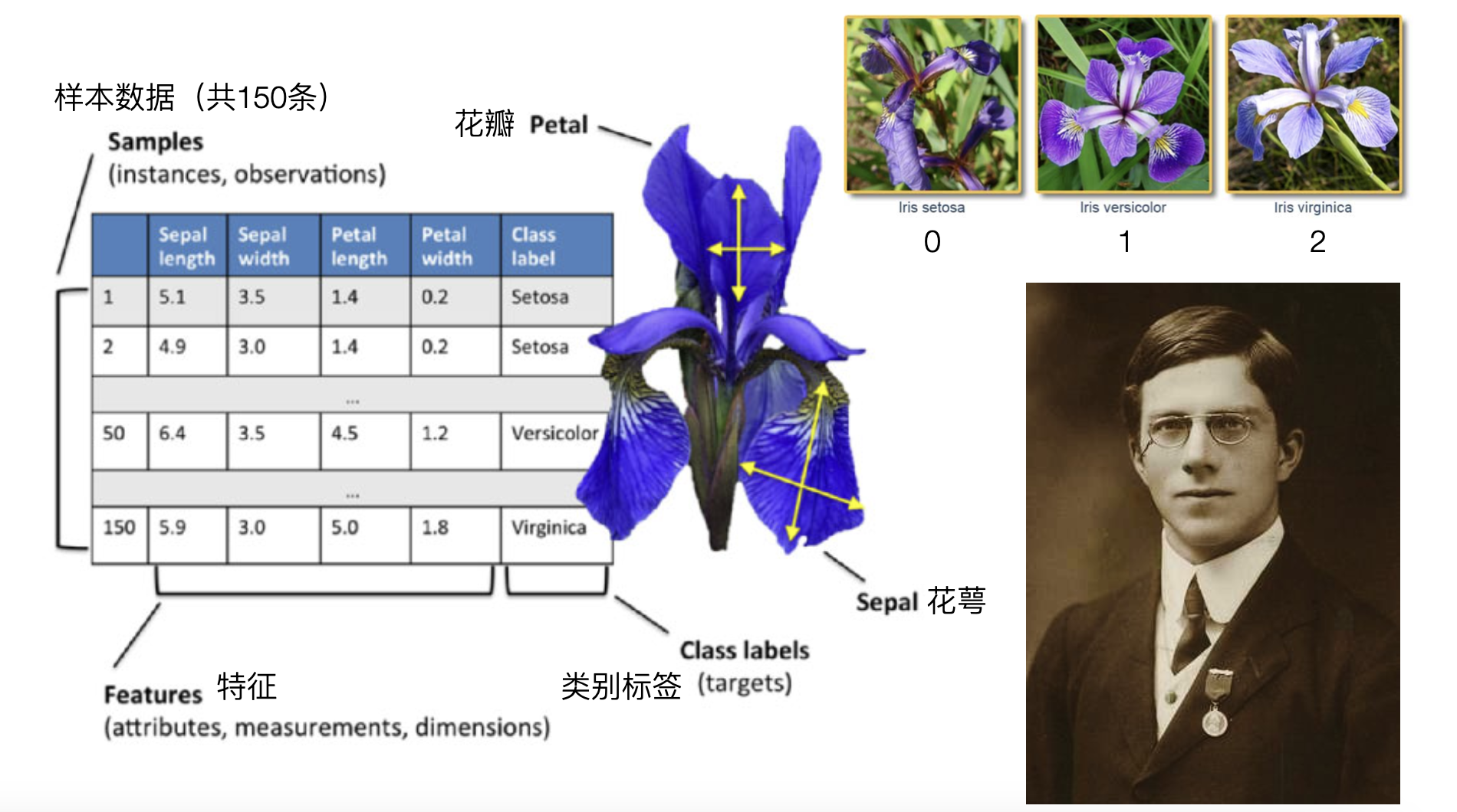鸢尾花数据集共有 150 条样本,其中包含 3 种类型的鸢尾花,分别是山鸢尾(Iris setosa)、多彩鸢尾(Iris versicolor)和为吉尼亚鸢尾(Iris virginica),如上图所示,每种各有50条样本。样本数据包含了 4 个特征(features)和 1 个类别标签(class label),4 个特征分别是花萼长度(Sepal length)、花萼宽度(Sepal width)、花瓣长度(Petal length)、花瓣宽度(Petal width),都是以厘米为单位的正数,数据集中的类别标签有 0、1、2 三个值,对应上面提到的三种鸢尾花类型。