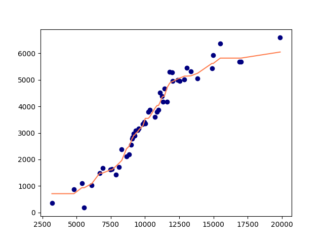 fit方法并不能接受一维数组作为它的第一个参数。这里提前对 X 和 y 排序是为了待会绘制散点图和折线图的时候根据 X 的值从小到大依次绘制。