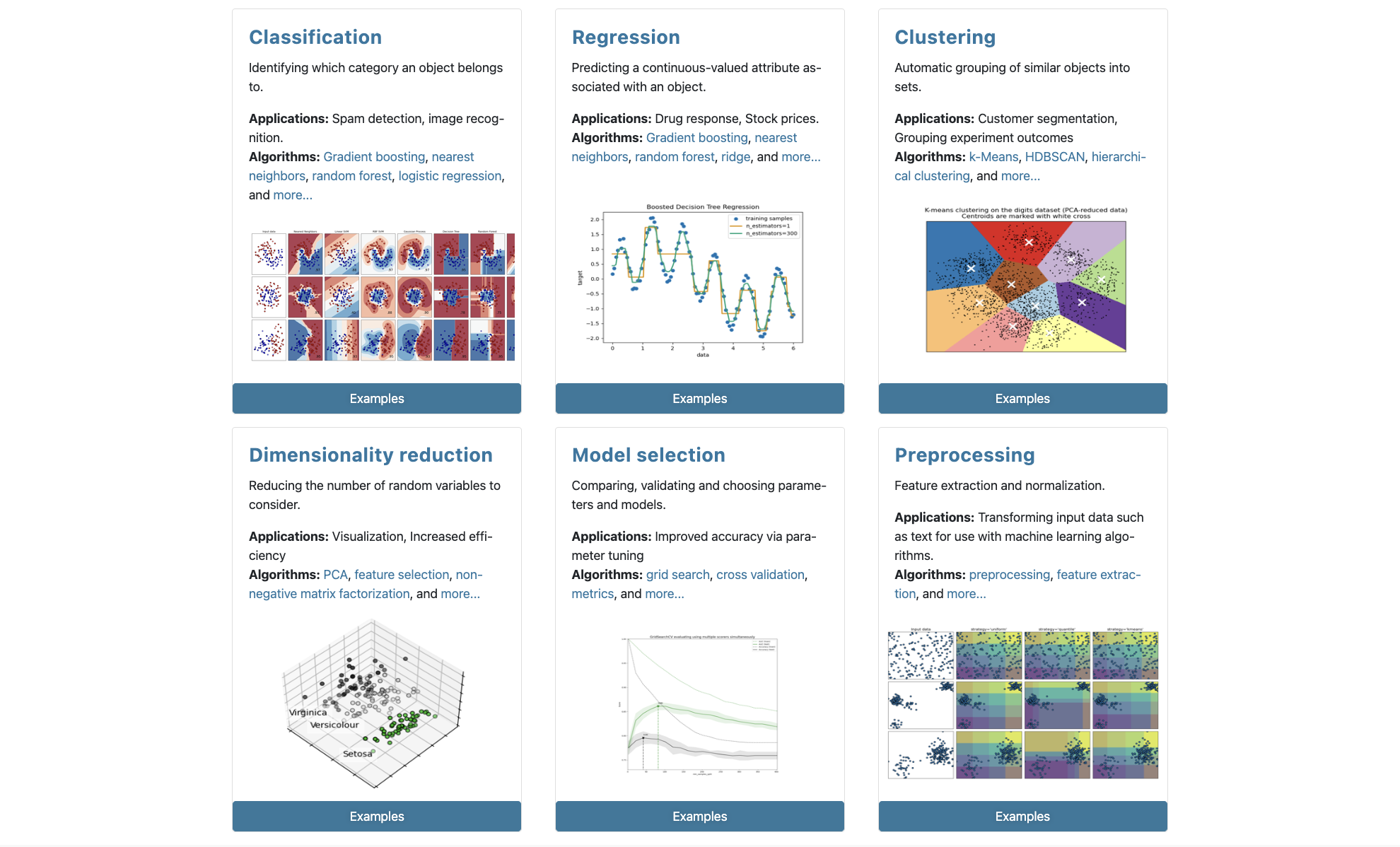 我们可以通过著名的 Python 机器学习库 scikit-learn 来加载这个数据集,scikit-learn 包含了各种分类、回归、聚类算法,同时还提供了多层感知机、支持向量机、随机森林等模型,覆盖了从数据预处理、特征工程到模型训练、模型评估和参数调优等各项功能,如下图所示。我们推荐大家使用这个库来完成机器学习中的各种操作,scikit-learn 的官方网站上面还提供了用户指南、API 文档和案例等内容,有兴趣的读者可以自行访问。