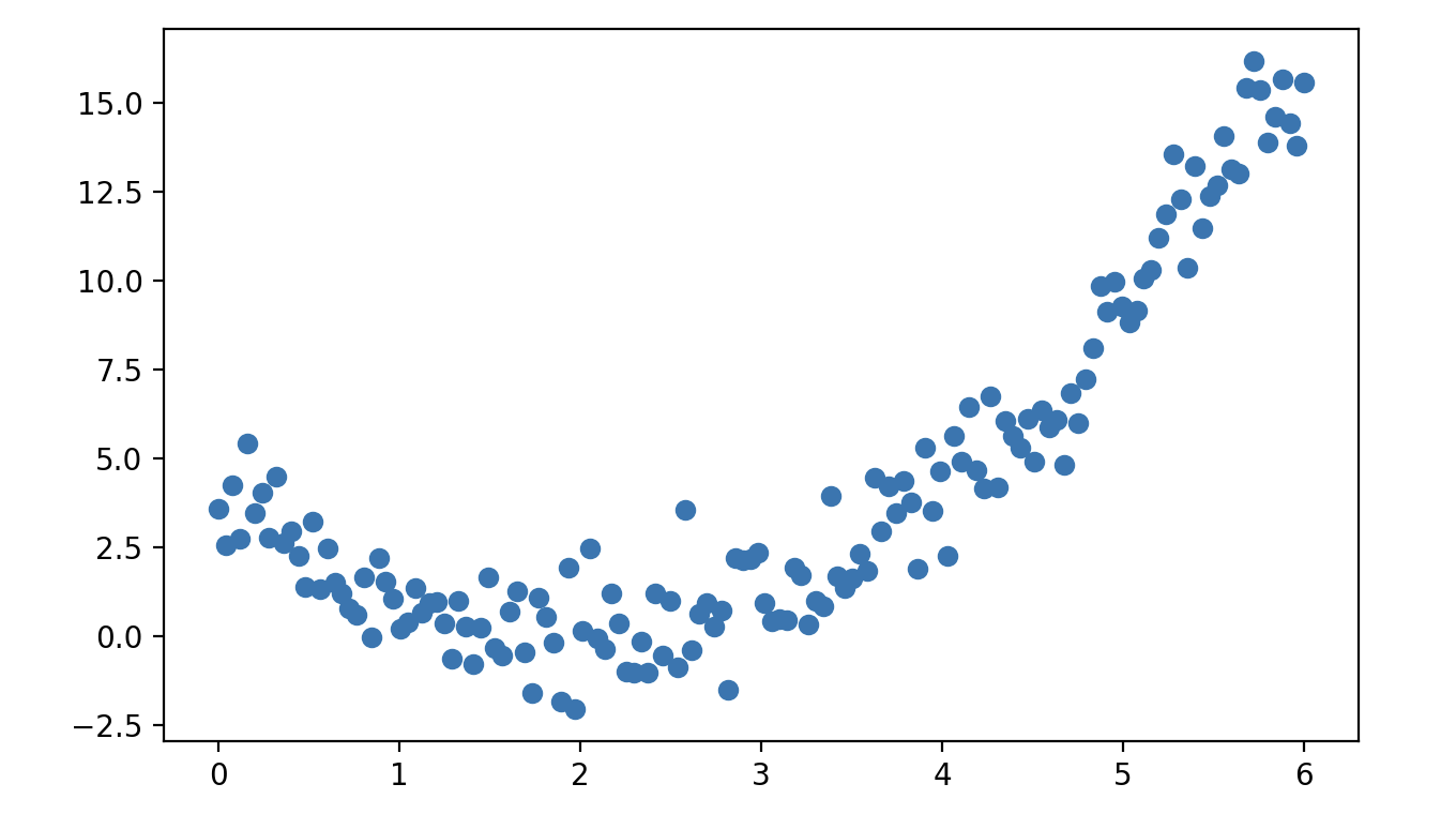 - 多项式回归(Polynomial Regression):引入高阶特征,使模型能拟合更复杂的非线性关系,属于线性模型的扩展,因为因为它对参数 $\small{\beta}$ 的求解仍然是线性形式,如下面所示的二次关系: