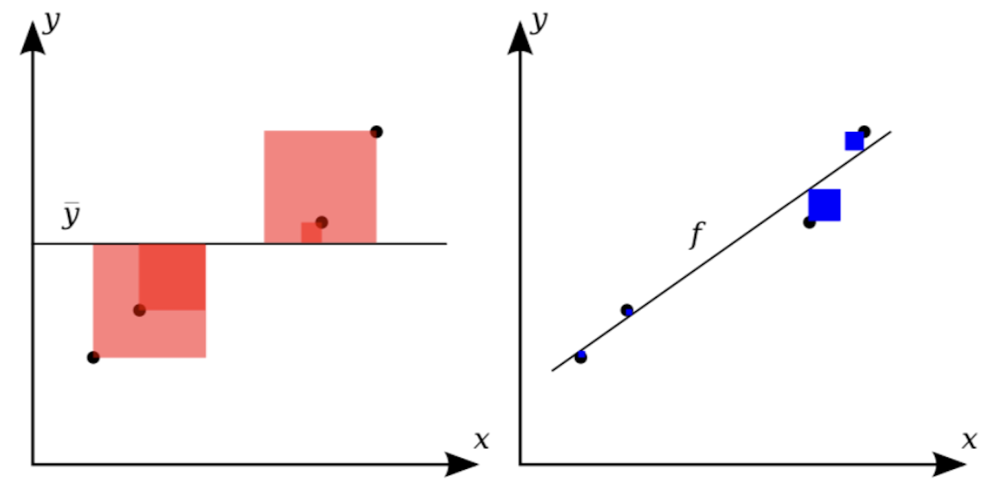 上图左边红色正方形的面积之和就是总平方和,右边蓝色正方形的面积之和就是残差平方和,很显然,模型拟合的效果越好,残差平方和除以总平方和的值就越接近 0, $\small{R^{2}}$ 的值就越接近 1。通常 $\small{R^{2} \ge 0.8}$ 时,我们认为模型的拟合效果已经很不错了。