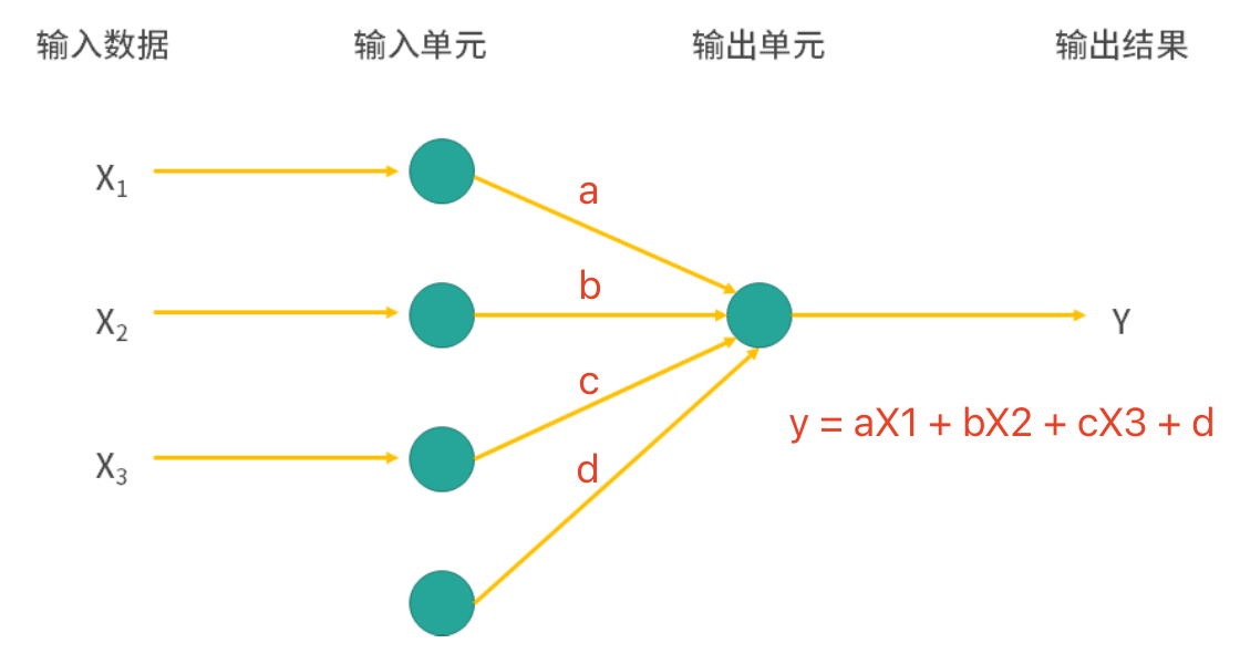 我们先设计一个最简单的神经网络模型,它只有一层输入和一层输出,该模型会根据输入( $\small{X}$ )去预测输出( $\small{y}$ ),而输出又满足下面的公式: